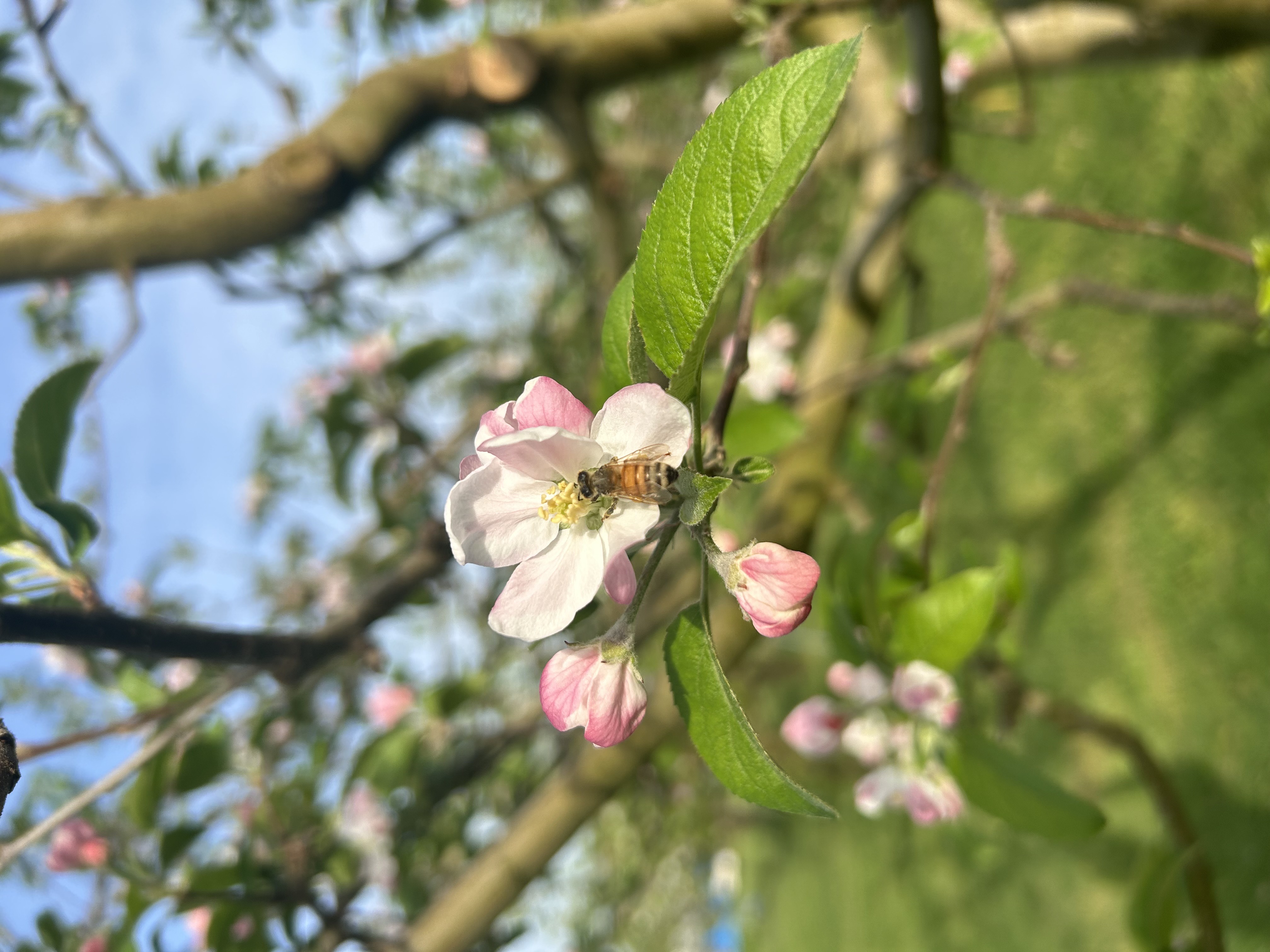 5月、園地はピンクの可愛らしい蕾と真っ白な花に包まれます。ミツバチたちが飛び交い、自然の力で授粉が行われます。※王将果樹園のはちみつはこの時採取されたりんごの花の香りが強く感じられます。