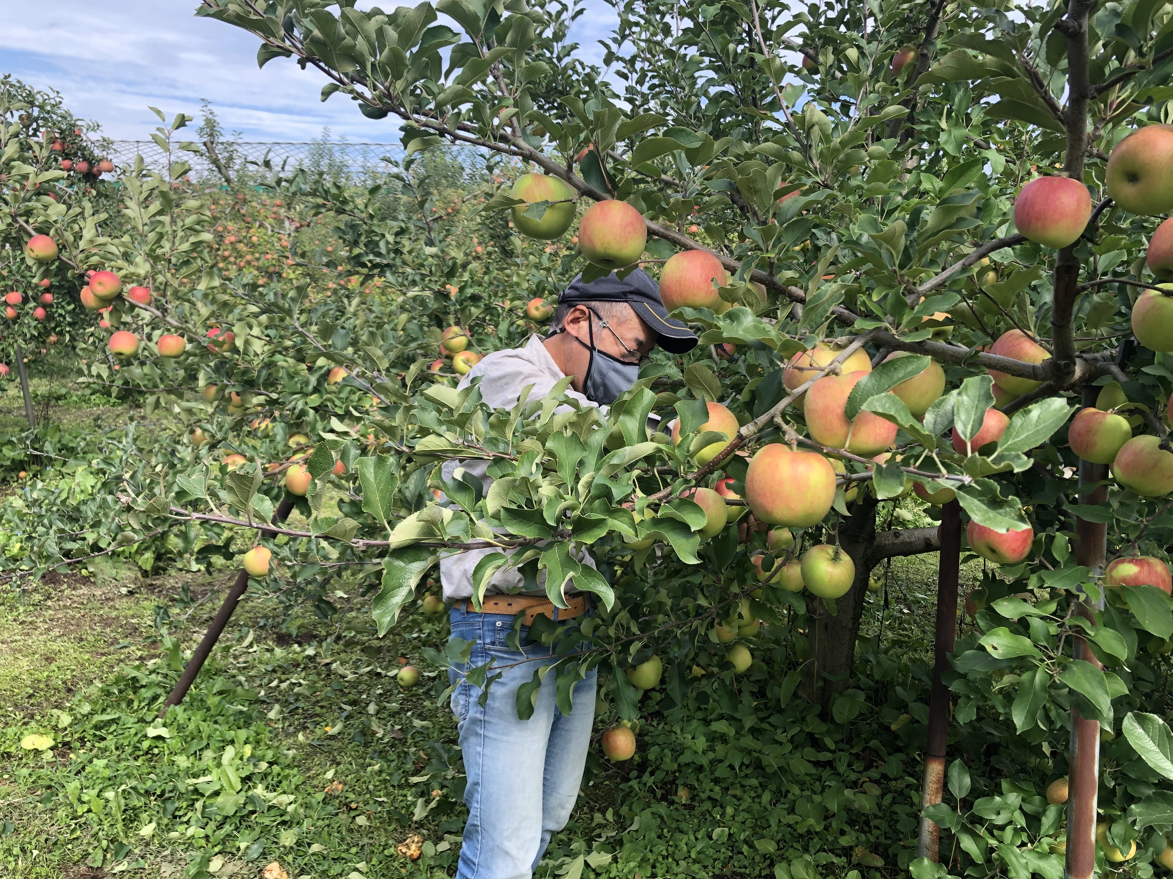 実を優しく回転させ、裏側まで日光を。均一な色づきと美味しさを実現するため、一玉一玉丁寧に回す職人のこだわりです。うっかりするとりんごがとれてしまうことも!