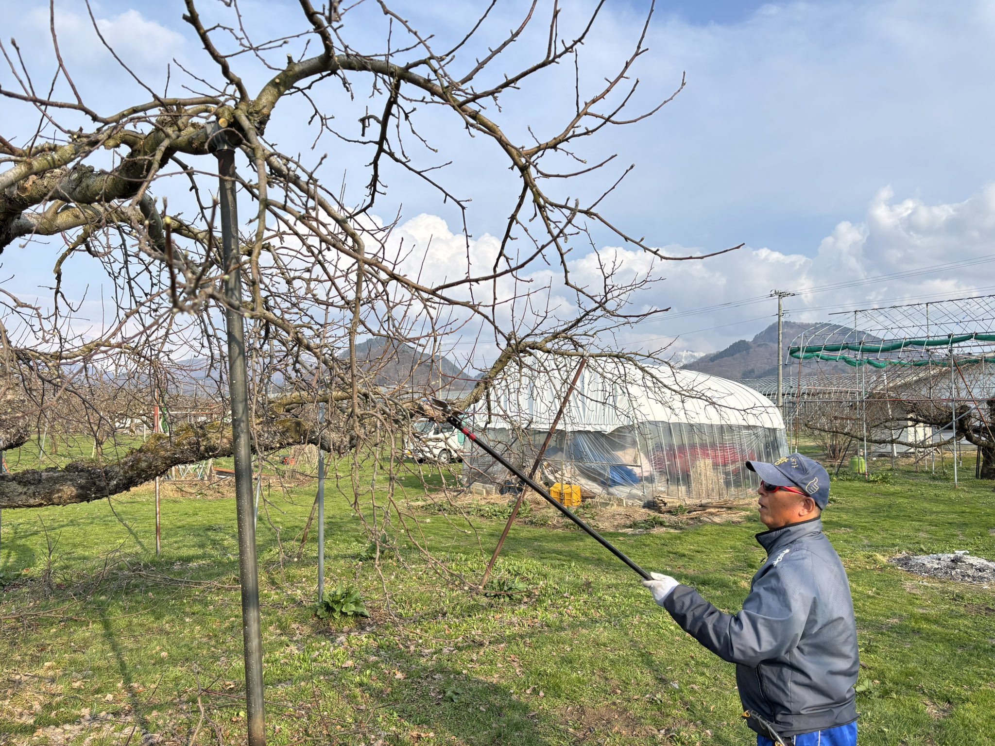 西洋梨、さくらんぼ、ももの剪定が終わった後、春の始まりの陽気を感じながら今シーズンの品質を決める最も大切な作業です。日当たりや風通しを考えながら、熟練の技で枝を整えます。