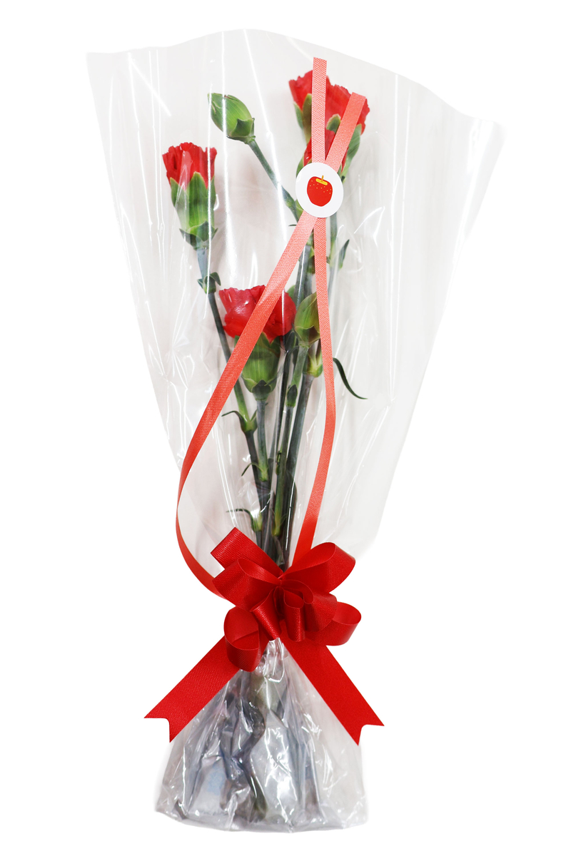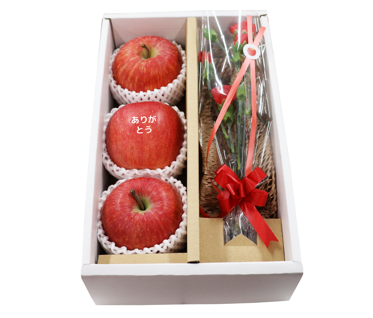 ・サンふじの雪国りんご「ありがとう」印字入り × 1玉 ・サンふじの雪国りんご × 2玉 ・カーネーション(赤) × 1束 |