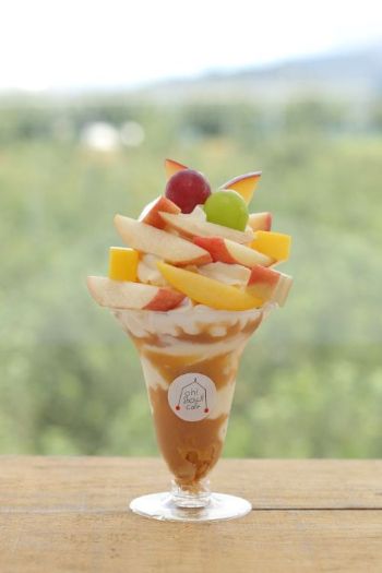 王将果樹園直営カフェ「oh!show!cafe」のももパフェは、やわらかい桃やかたい桃、黄色い桃などの食べ比べができるパフェです。ぜひお召し上がりください!