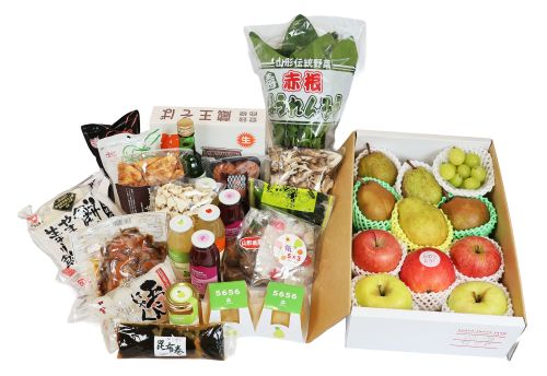 サンふじ、黄色いりんご、ラ・フランスなど旬のフルーツの他山形のお正月らしいものを詰め合わせます。