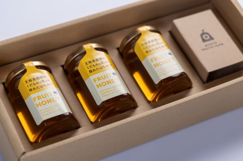 王将果樹園で育てている果物の花が満開の季節に、ミツバチが一生懸命に集めた「はちみつ」です。山形県内で活躍する蜂場家、齋藤雄介さん(齋藤みつばち)と連携して商品化した王将果樹園オリジナルの「はちみつ」です。